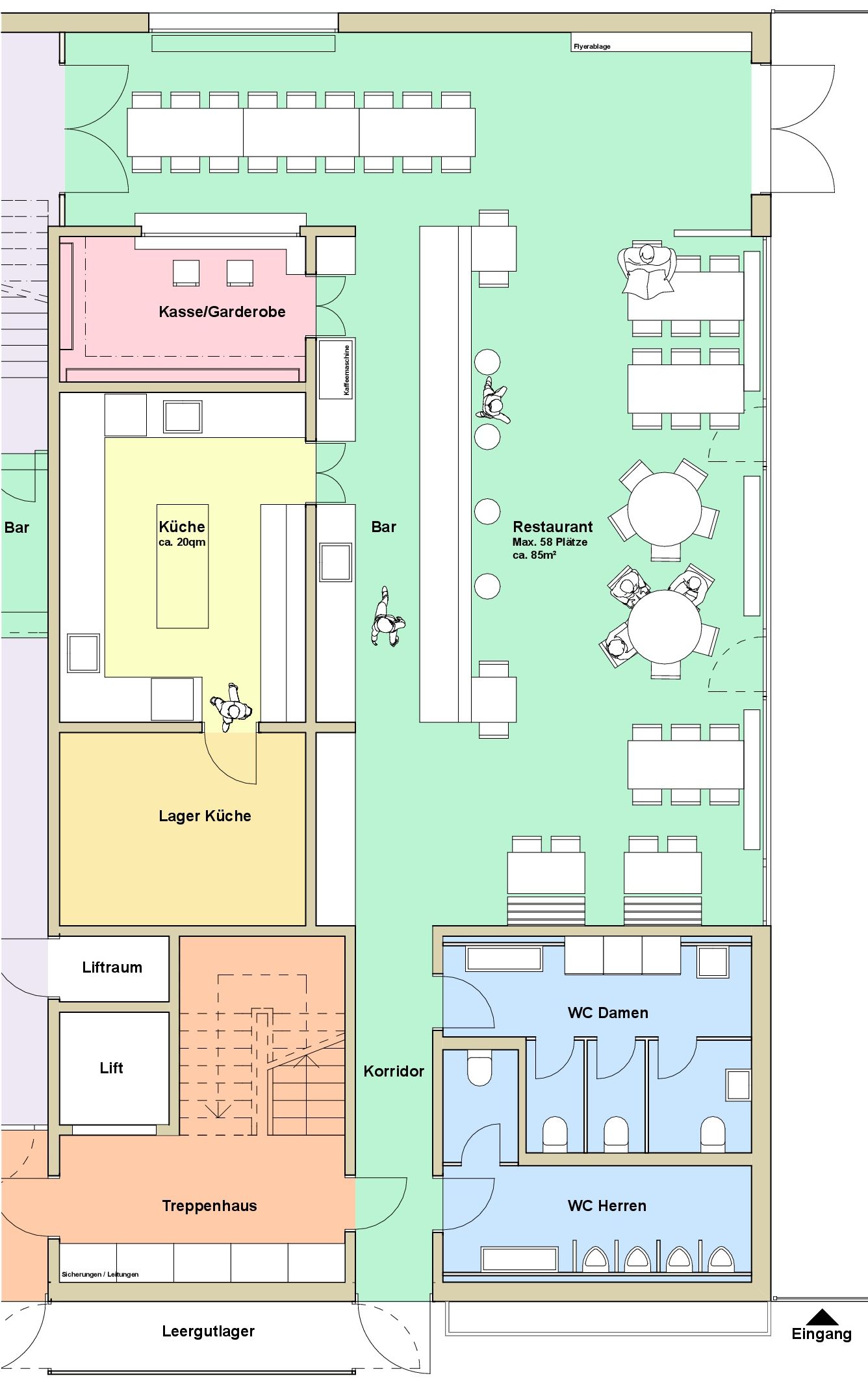 Unsere Beiz ist gleichzeitig auch Restaurant und bietet mit ihren 85qm Fläche ausreichend Platz für eine individuelle Nutzung. Bestuhlt fasst sie max. 58 Sitzplätze, aber auch weniger materialbestückt sind Apéros oder ähnliche (kulinarische) Anlässe denkbar. Für Feste im kleinen Rahmen (ca. 100 Personen), Barkonzerte, Spieleabende und natürlich Bankette ist ausreichend Bewegungsfreiheit vorhanden.